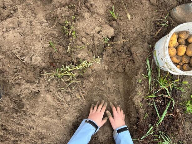 Im Gewächshaus haben wir den Kompost verteilt, im Garten Gemüse geerntet, Äpfel gepflückt und auf dem Feld Kartoffeln geerntet.